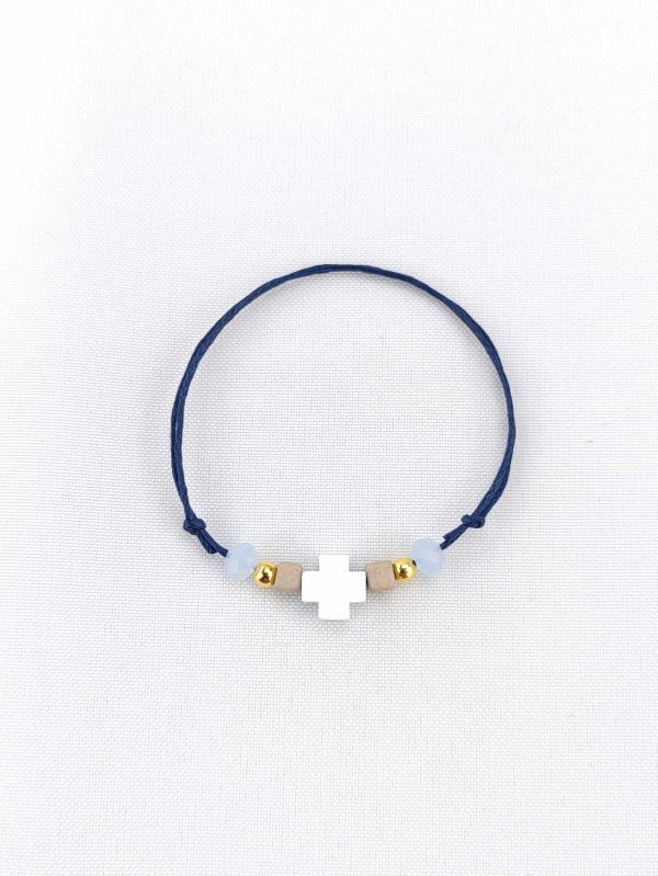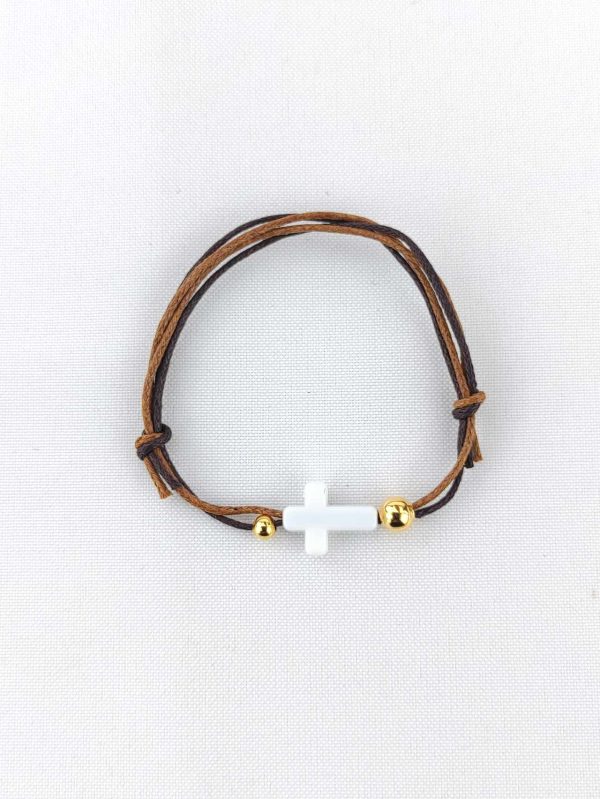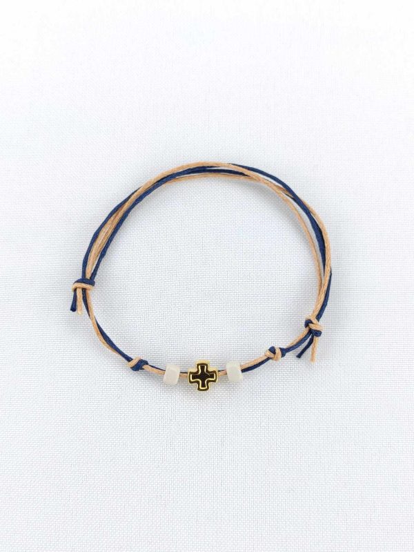 Χειροποίητο μαρτυρικό βραχιόλι με ημικερωμένο κορδόνι, επίχρυσα στοιχεία και ακρυλικό σταυρό. Η συσκευασία περιλαμβάνει 50 τεμάχια και το κουτί μαρτυρικών.