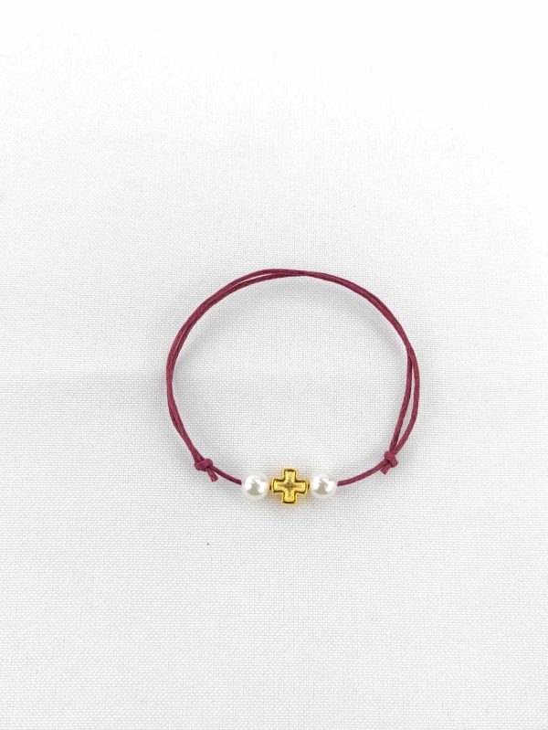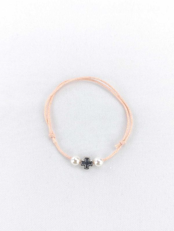 Χειροποίητο μαρτυρικό βραχιόλι με ημικερωμένο κορδόνι, πέρλες και επίχρυσο σταυρό. Η συσκευασία περιλαμβάνει 50 τεμάχια και το κουτί μαρτυρικών.