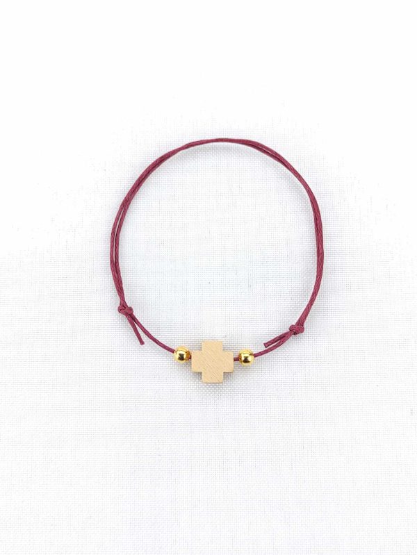 Χειροποίητο μαρτυρικό βραχιόλι με ημικερωμένο κορδόνι, επίχρυσα στοιχεία και ξύλινο σταυρό. Η συσκευασία περιλαμβάνει 50 τεμάχια και το κουτί μαρτυρικών.