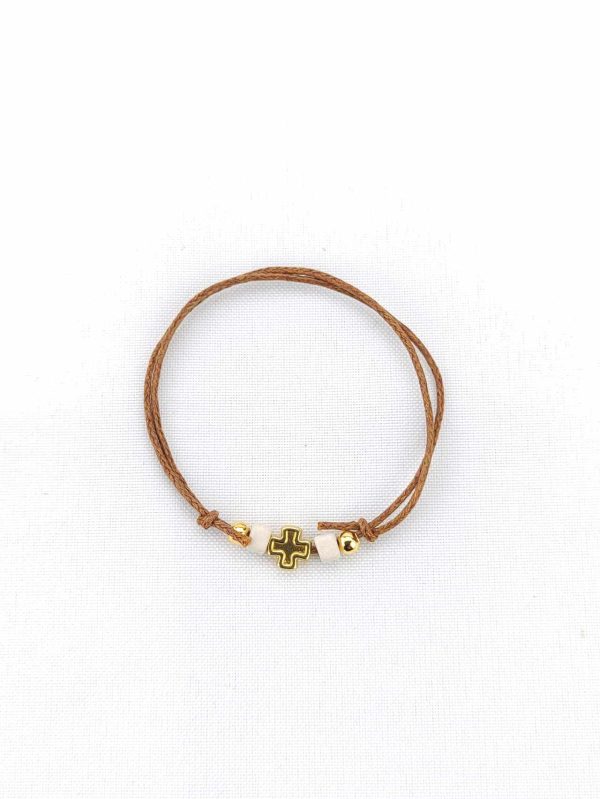 Χειροποίητο μαρτυρικό βραχιόλι με ημικερωμένο κορδόνι, επίχρυσα στοιχεία, επίχρυσο σταυρό και κεραμικά κυβάκια. Η συσκευασία περιλαμβάνει 50 τεμάχια και το κουτί μαρτυρικών.