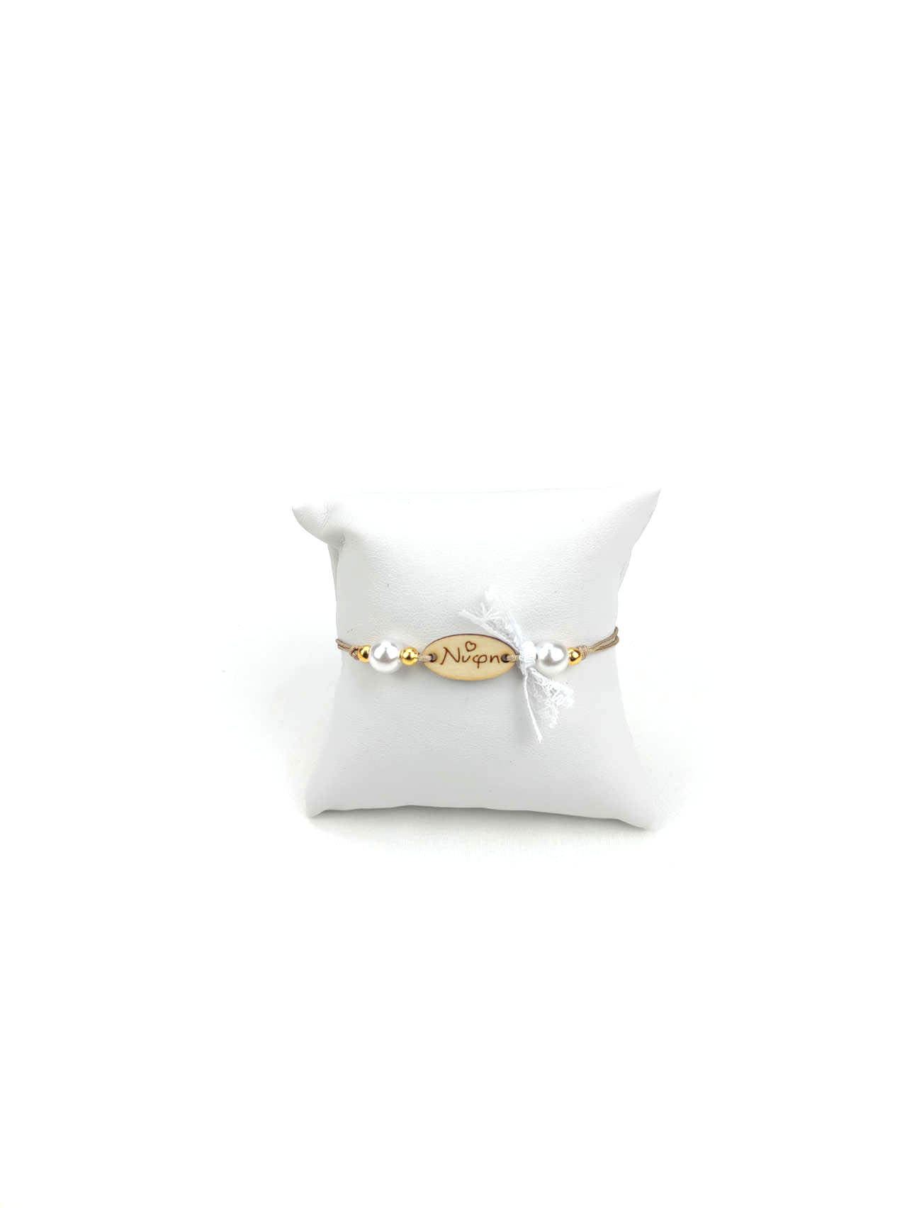Χειροποίητο βραχιόλι με ξύλινο μοτίφ Νύφη, πέρλες, επίχρυσες μπίλιες και δανδέλα.