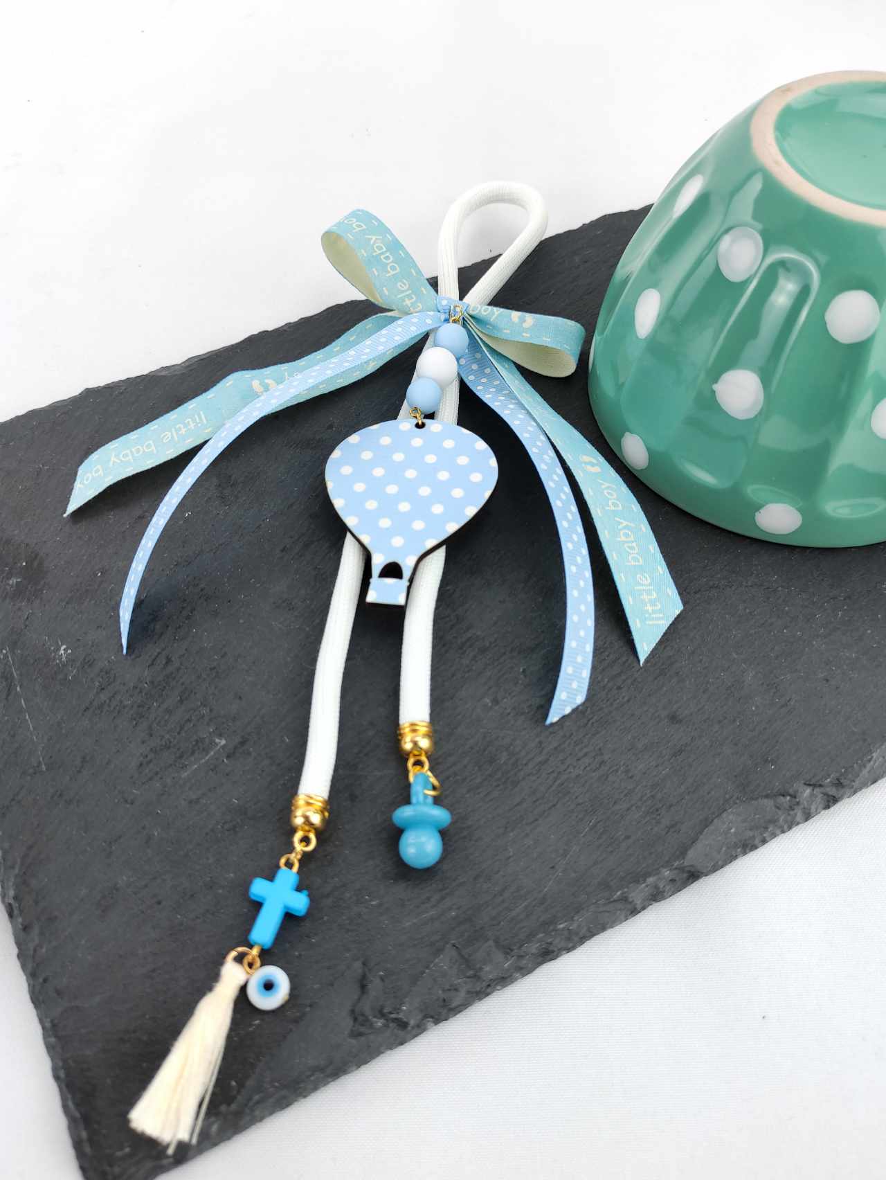 Χειροποίητο γούρι για νεογέννητο αγόρι με κορδόνι,κορδέλες,ξύλινο στοιχείο και χάντρες.