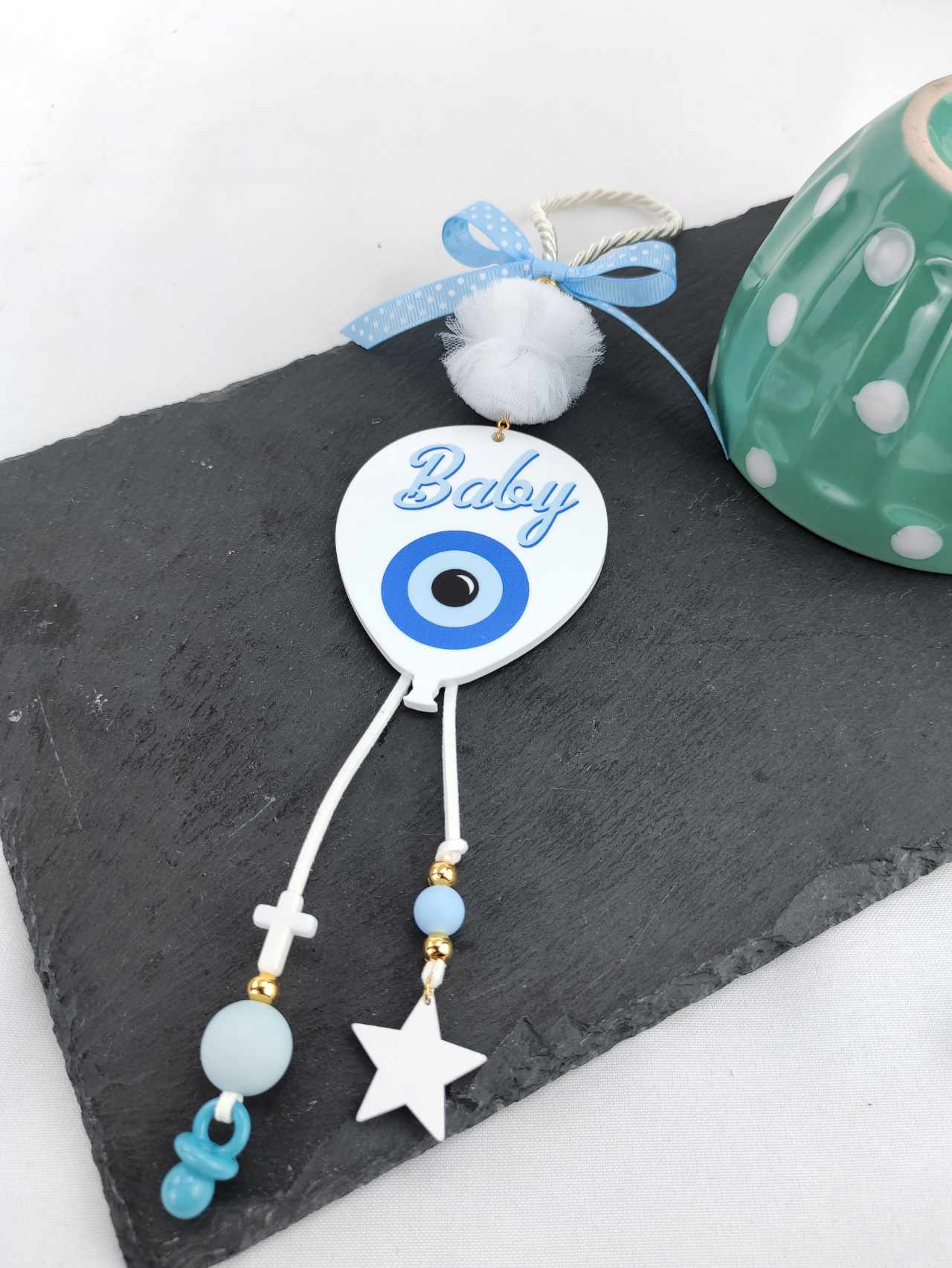 Χειροποίητο γούρι για νεογέννητο αγόρι με κορδόνι,κορδέλες,plexiglss στοιχείο και χάντρες.