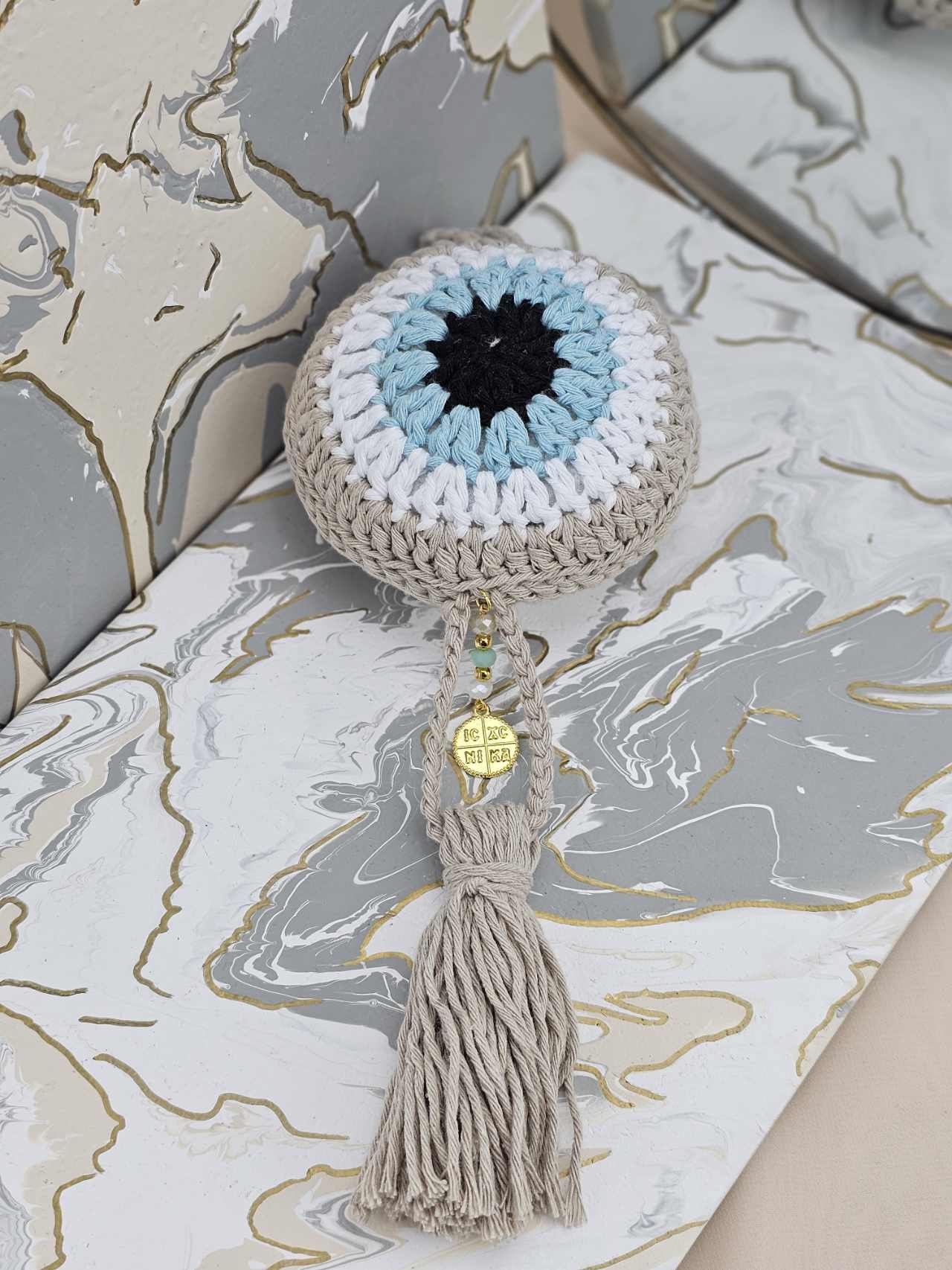 Γούρι για Νεογέννητο Amabile Πλεκτό Μάτι Μπεζ – Γαλάζιο