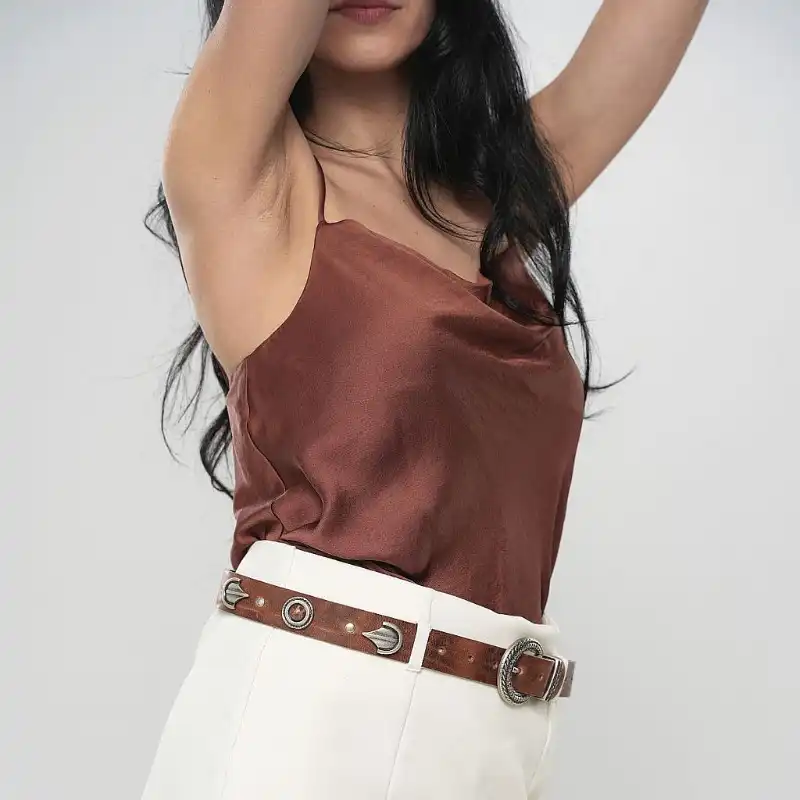 Δερμάτινη γυναικεία ζώνη WB807 της εταιρίας Nino Venturi με εντυπωσιακή αγκράφα υψηλής αντοχής.Η Buff tan δροσερή απόχρωση που θυμίζει την απλότητα και την φυσικότητα του δέρματος, για μια κομψή και minimal εμφάνιση. Tip! Είτε την φορέσεις με ένα λευκό λινό φόρεμα είτε με ένα denim σορτς και cropped top, θα προσθέσει μια αίσθηση φυσικής πολυτέλειας σε κάθε outfit. Μια ζώνη που φέρνει τη ρουστικ γοητεία του καλοκαιριού στην καρδιά της γκαρνταρόμπας σου