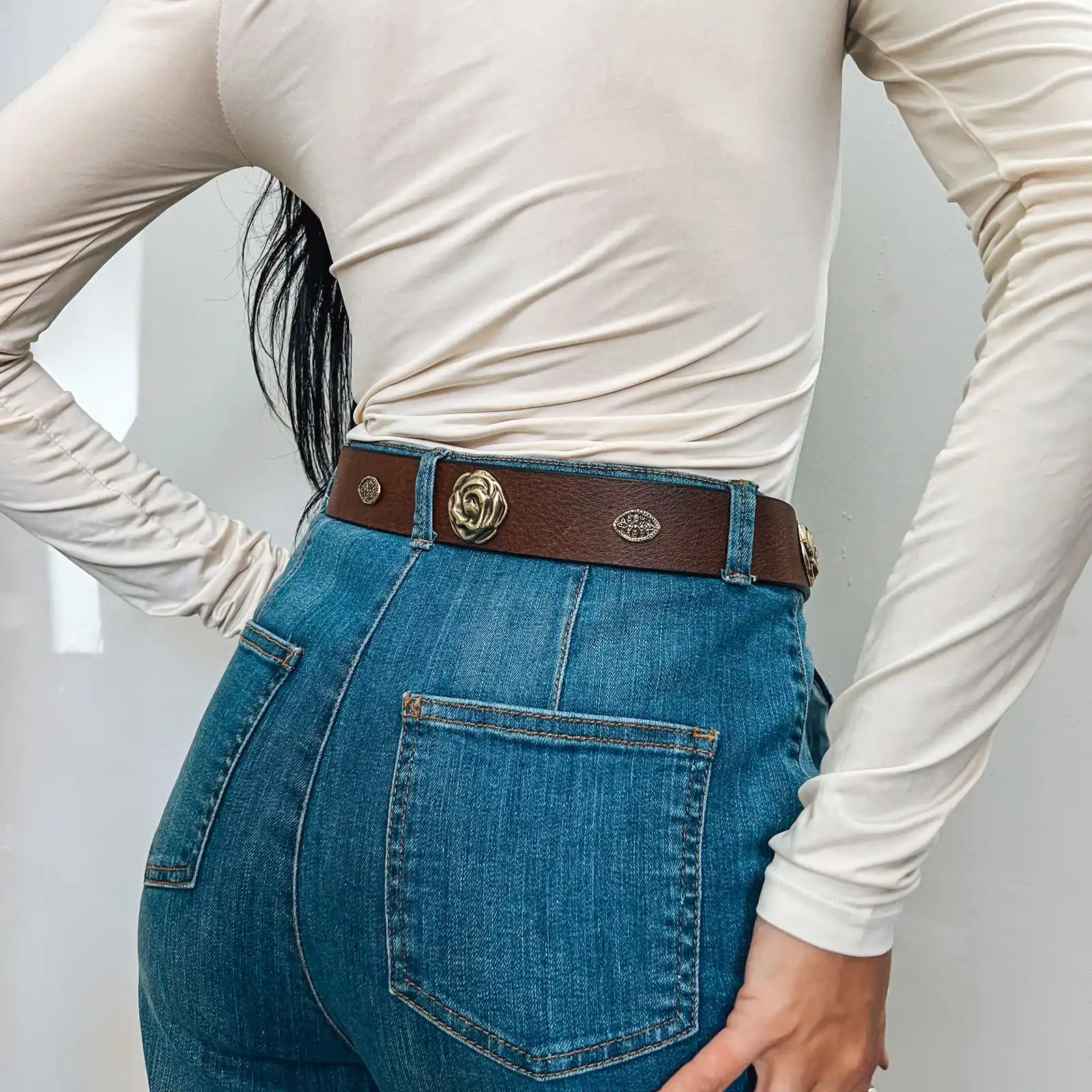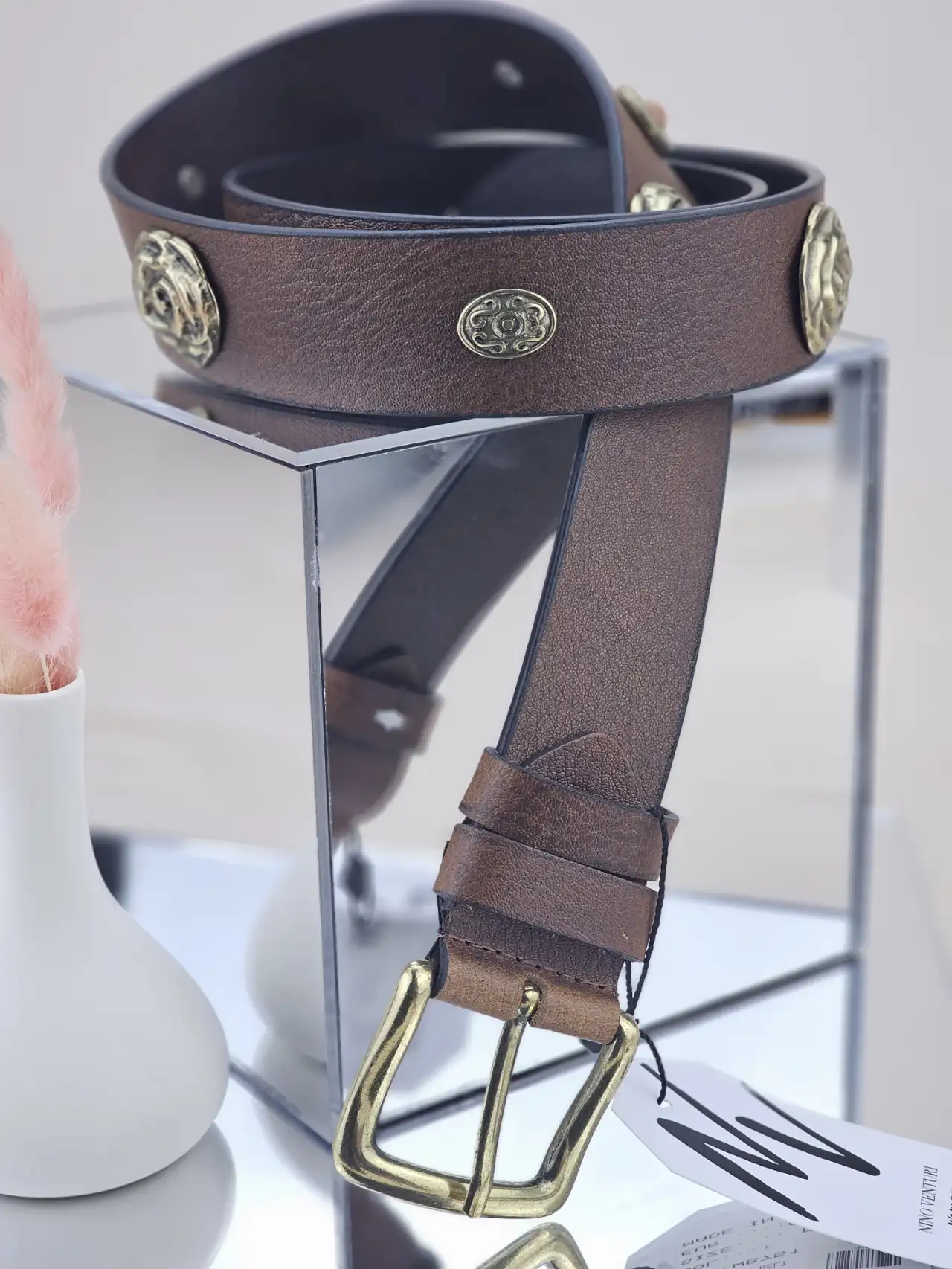 Δερμάτινη γυναικεία ζώνη της εταιρίας Nino Venturi με μεταλλικά στοιχεία.