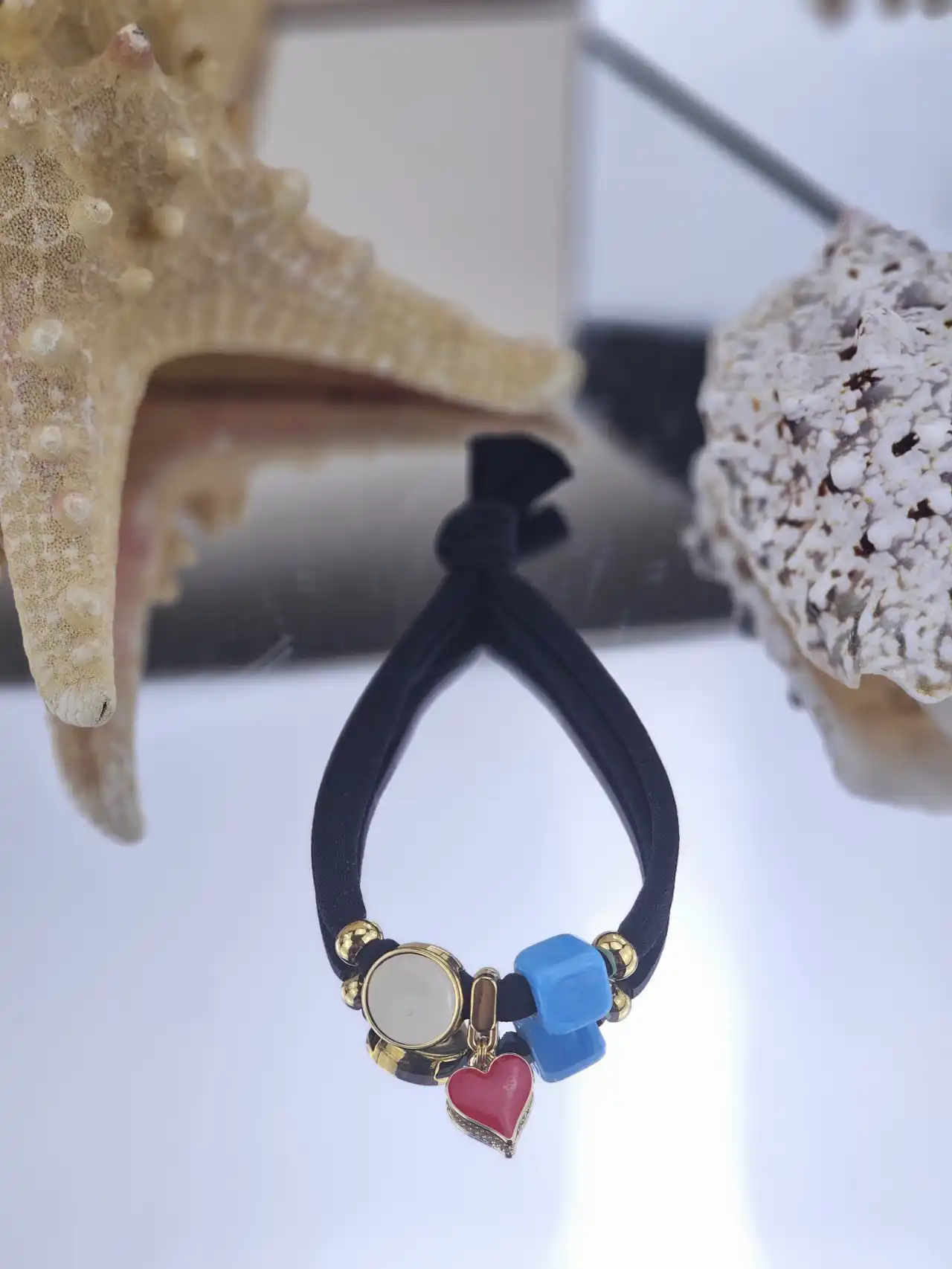 Γυναικείο βραχιόλι με ελαστικό κορδόνι, επίχρυσα περαστά και κρεμαστά στοιχεία.