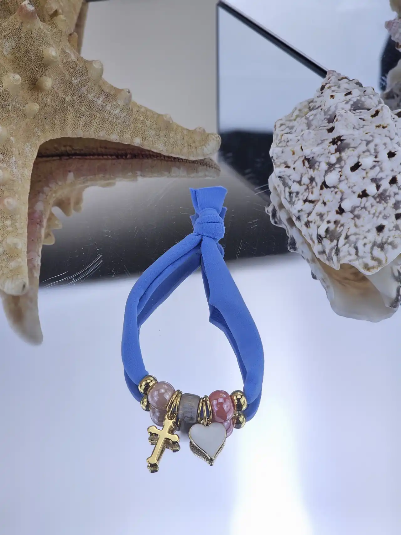 Γυναικείο βραχιόλι με ελαστικό κορδόνι, επίχρυσα περαστά και κρεμαστά στοιχεία.