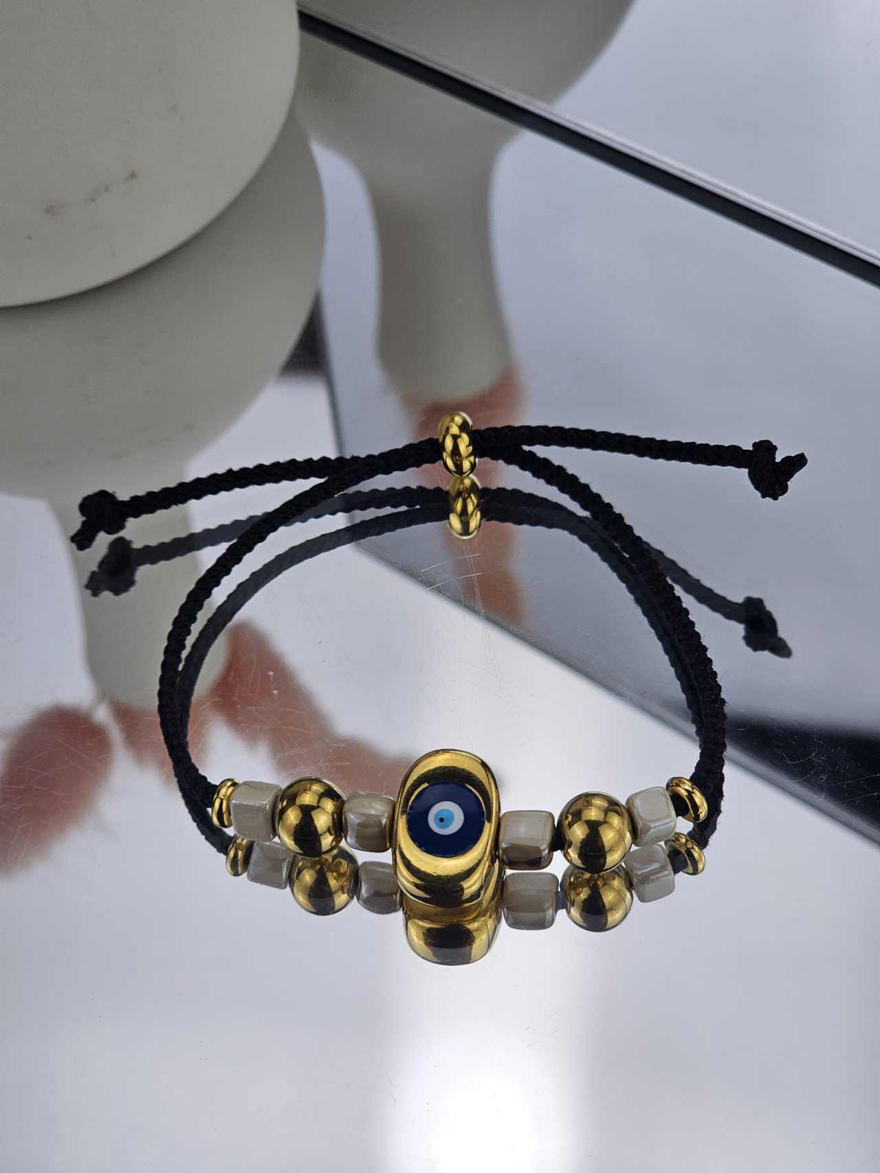 Γυναικείο βραχιόλι από κορδόνι,με επιχρυσωμένο μοτίφ μάτι, κεραμικές πέτρες και ατσάλινα στοιχεία.