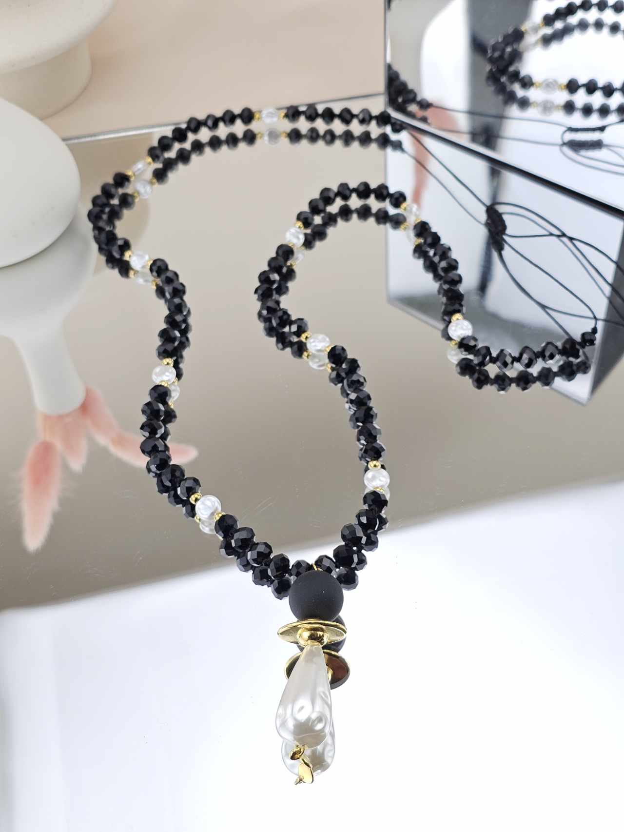 Χειροποίητο γυναικείο κολιέ από γυάλινες πέτρες, πέρλες δεμένες με κορδόνι, επίχρυσα στοιχεία και κρεμαστό μοτίφ.