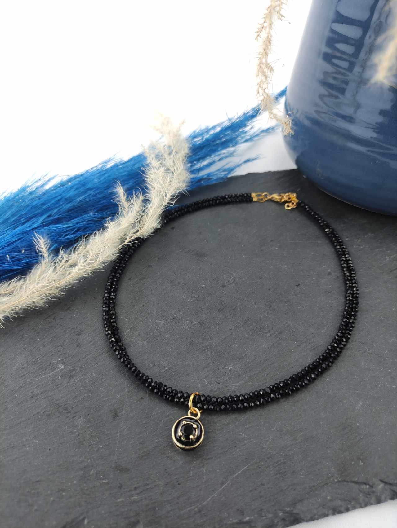 Χειροποίητο γυναικείο κολιέ με 2 σειρές από γυάλινες πέτρες και επίχρυσα στοιχείο με σμάλτο.