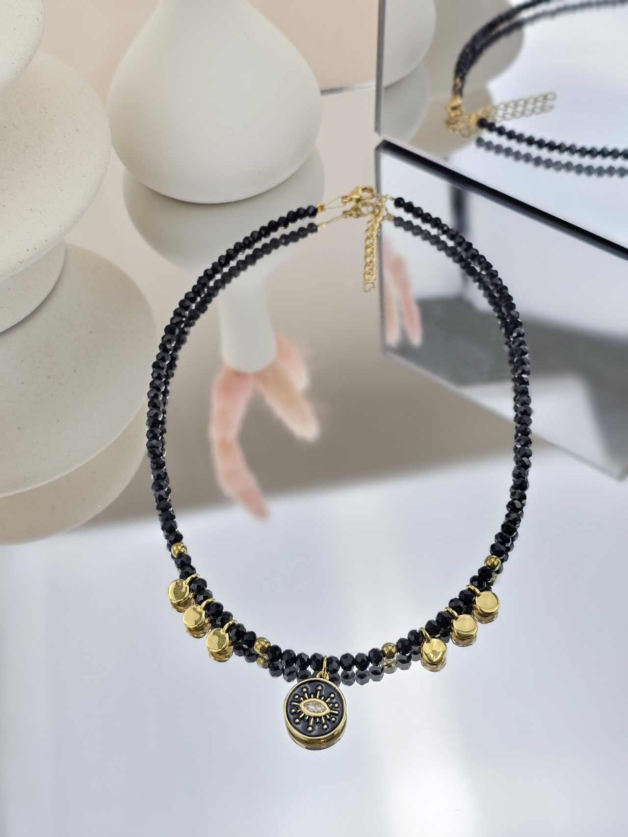 Χειροποίητο γυναικείο κολιέ από γυάλινες πέτρες, επίχρυσα στοιχεία και κρεμαστό στοιχείο ματάκι.