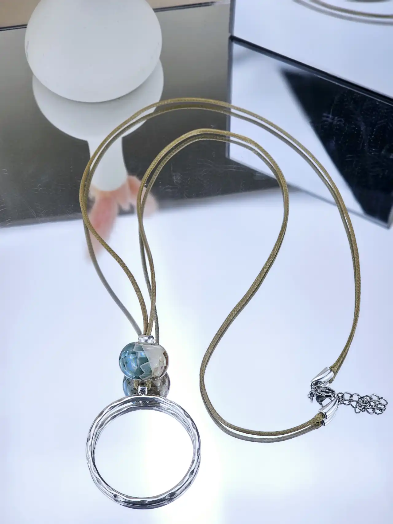 Χειροποίητο γυναικείο κολιέ μακρύ με κορδόνι, κεραμική πέτρα και επάργυρο μοτίφ.