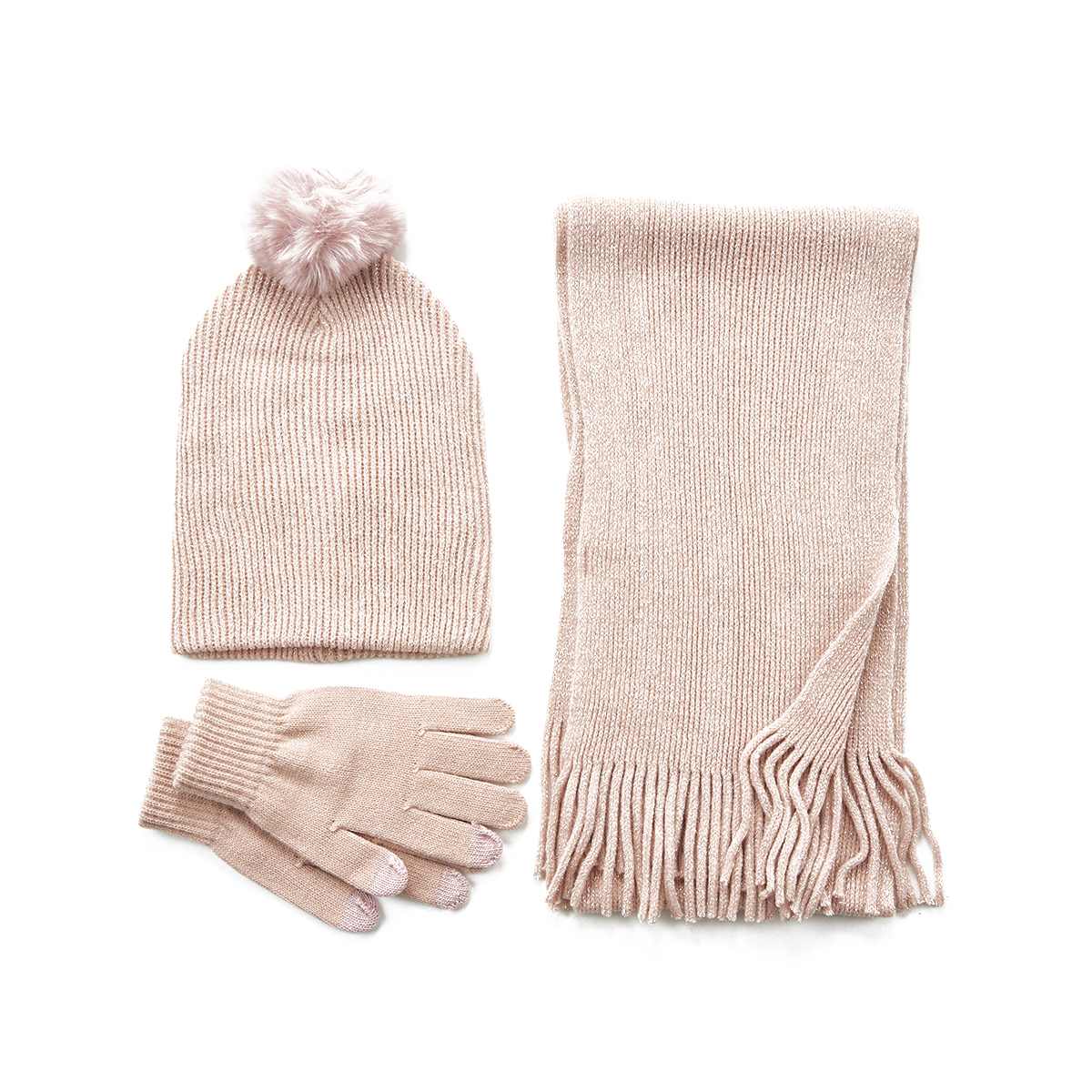 Γυναικείο σετ που περιλαμβάνει σκούφο με πομπον στην κορυφή, γάντια και κασκόλ.