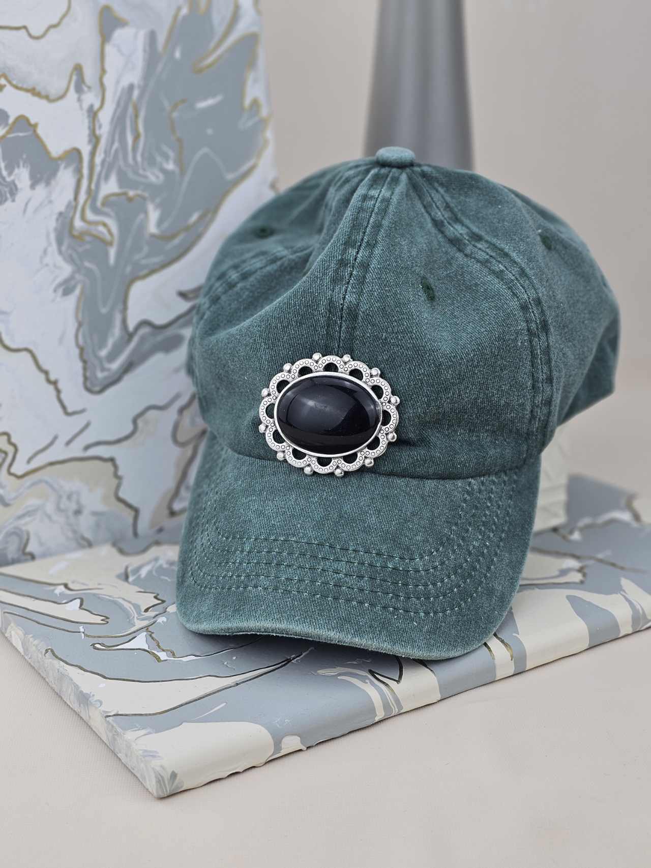Χειροποίητο γυναικείο καπέλο jockey της εταιρίας Lavita Handbags με μεταλλικά στοιχεία.