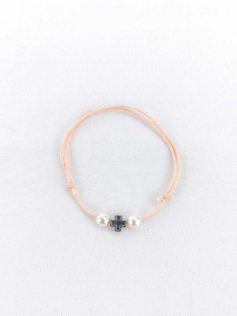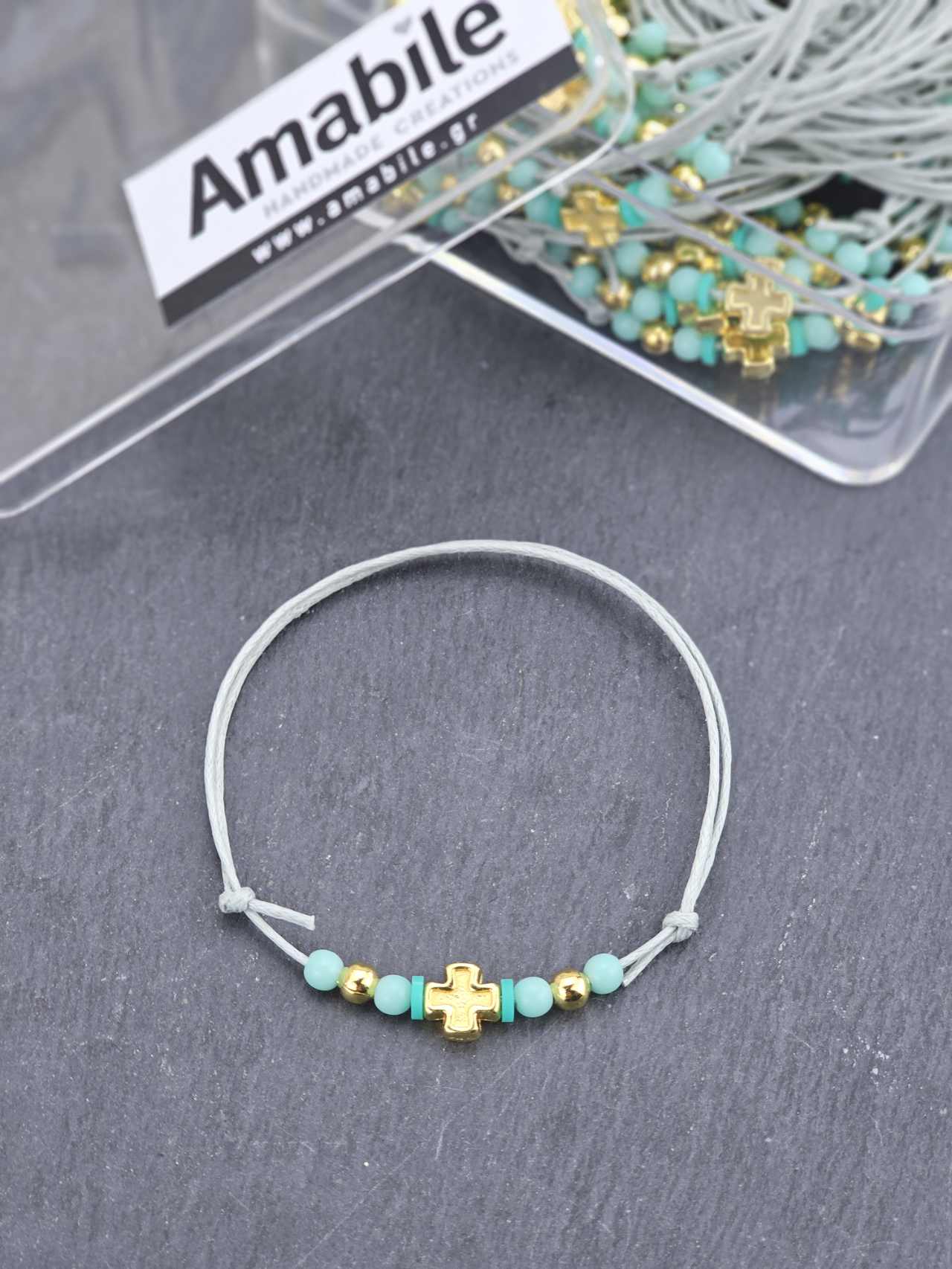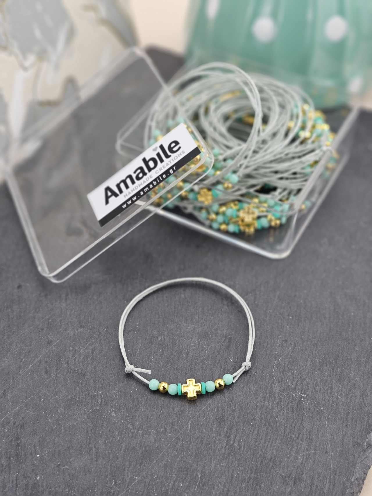 Χειροποίητο μαρτυρικό βραχιόλι με ημικερωμένο κορδόνι μεταλλικό σταυρό και χάντρες. Η συσκευασία περιλαμβάνει 50 τεμάχια και το κουτί μαρτυρικών.