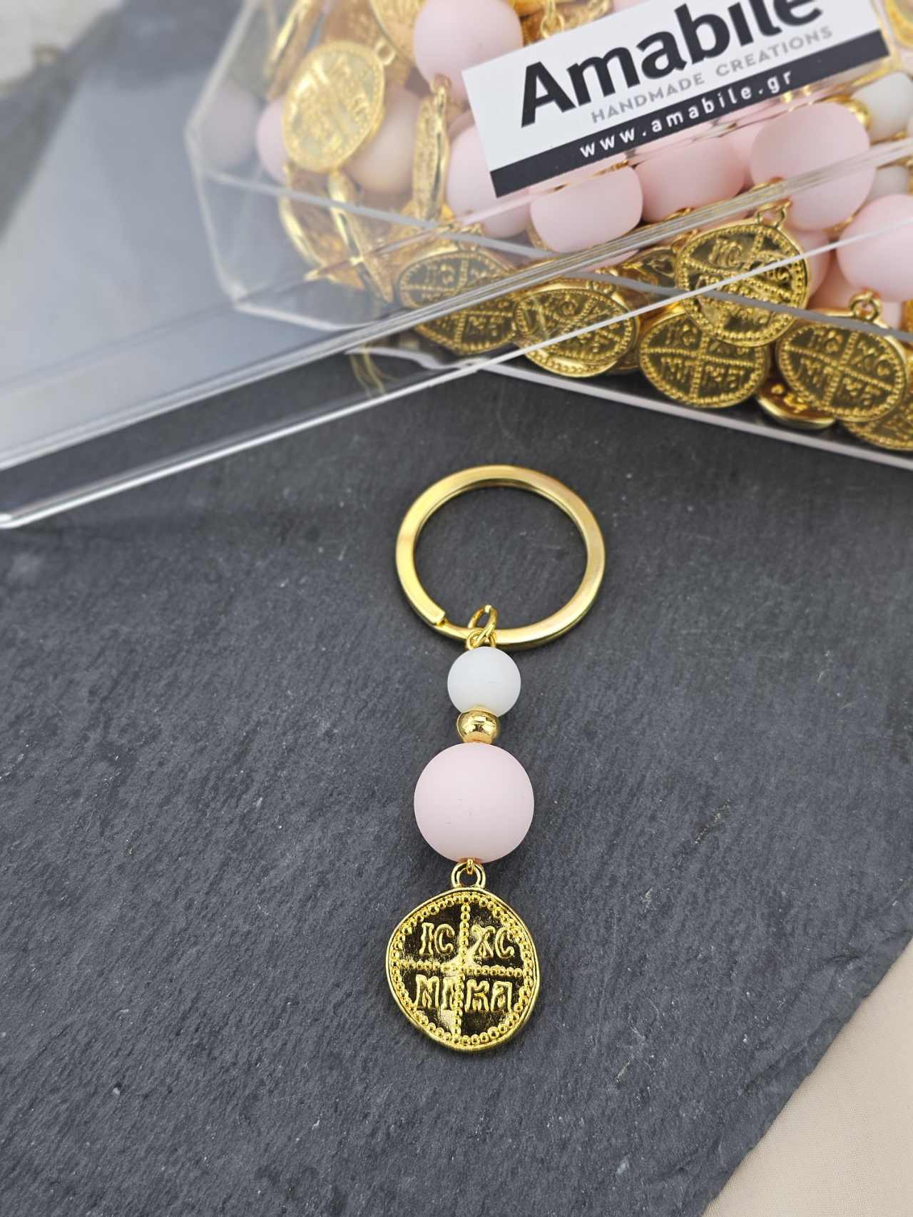 Χειροποίητο μαρτυρικό βάπτισης μπρελόκ με χάντρες και επίχρυσο Κωνσταντινάτο.Η συσκευασία περιλαμβάνει 50 τεμάχια και το κουτί μαρτυρικών.