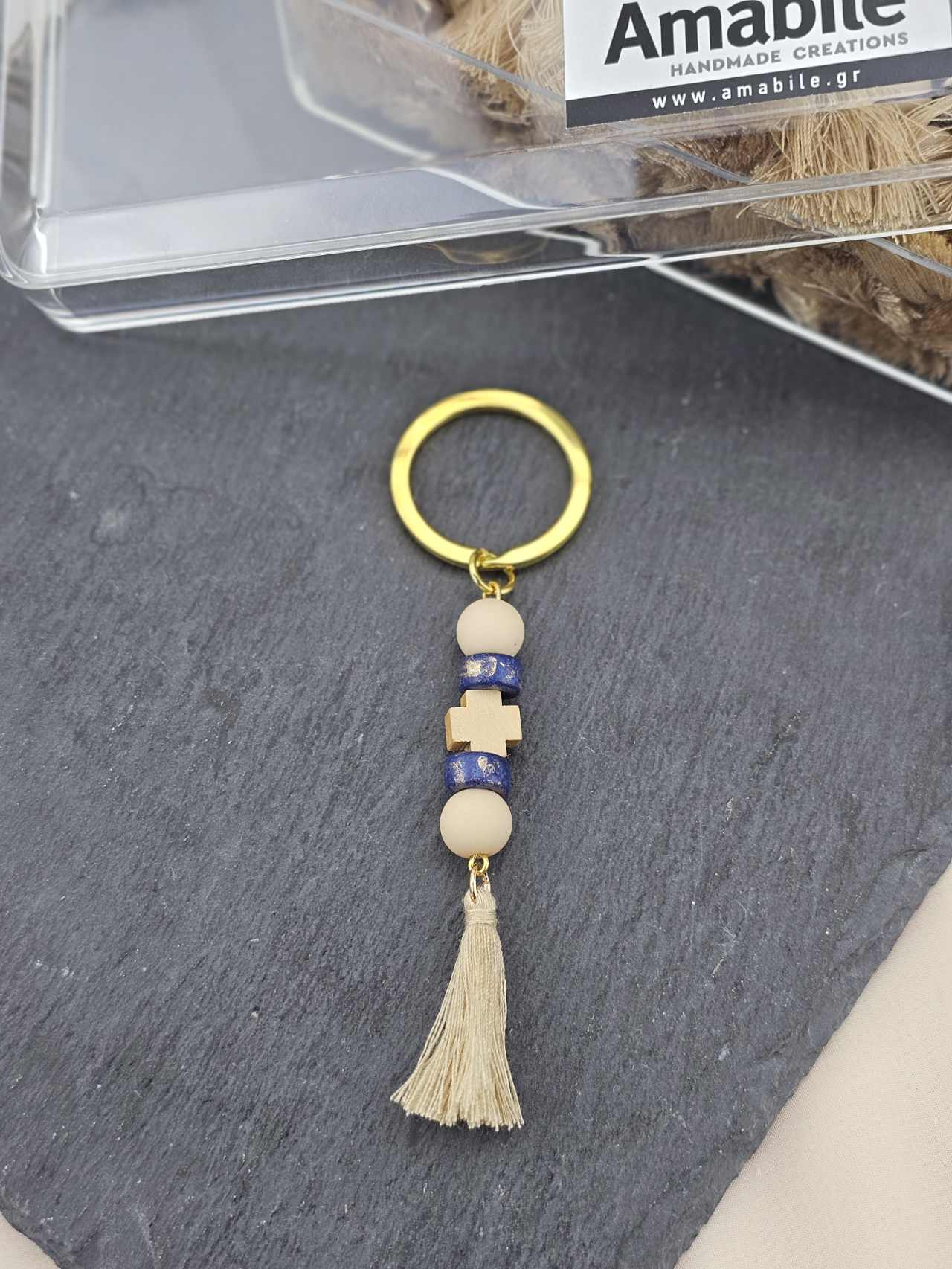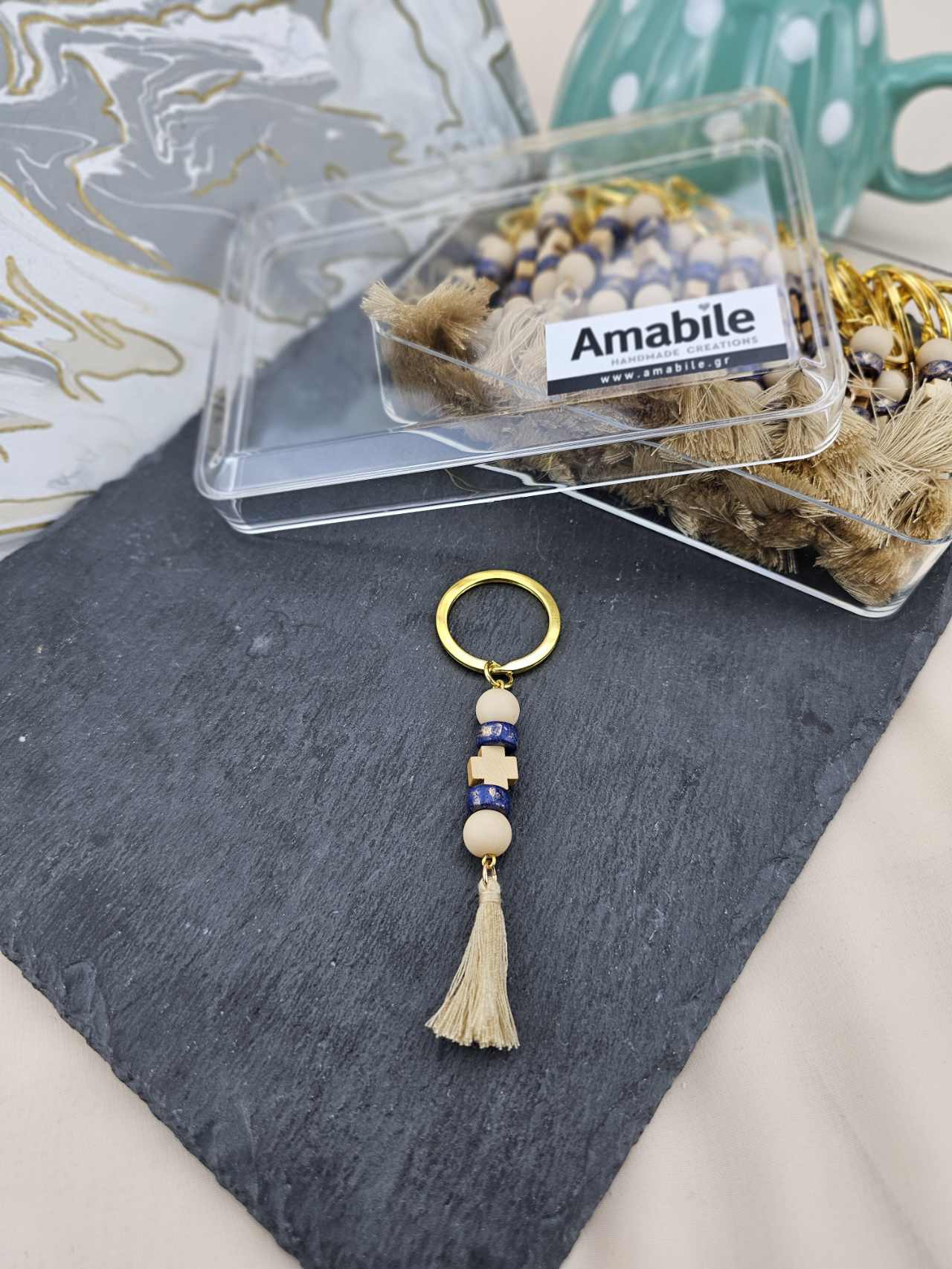 Χειροποίητο μαρτυρικό βάπτισης μπρελόκ με χάντρες, ξύλινο σταυρό και φουντάκι.Η συσκευασία περιλαμβάνει 50 τεμάχια και το κουτί μαρτυρικών.