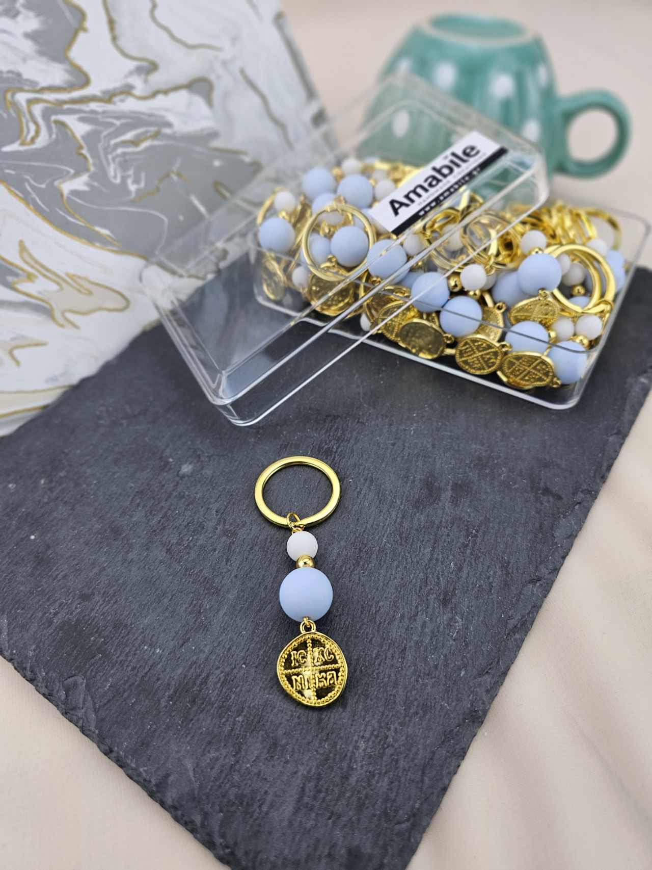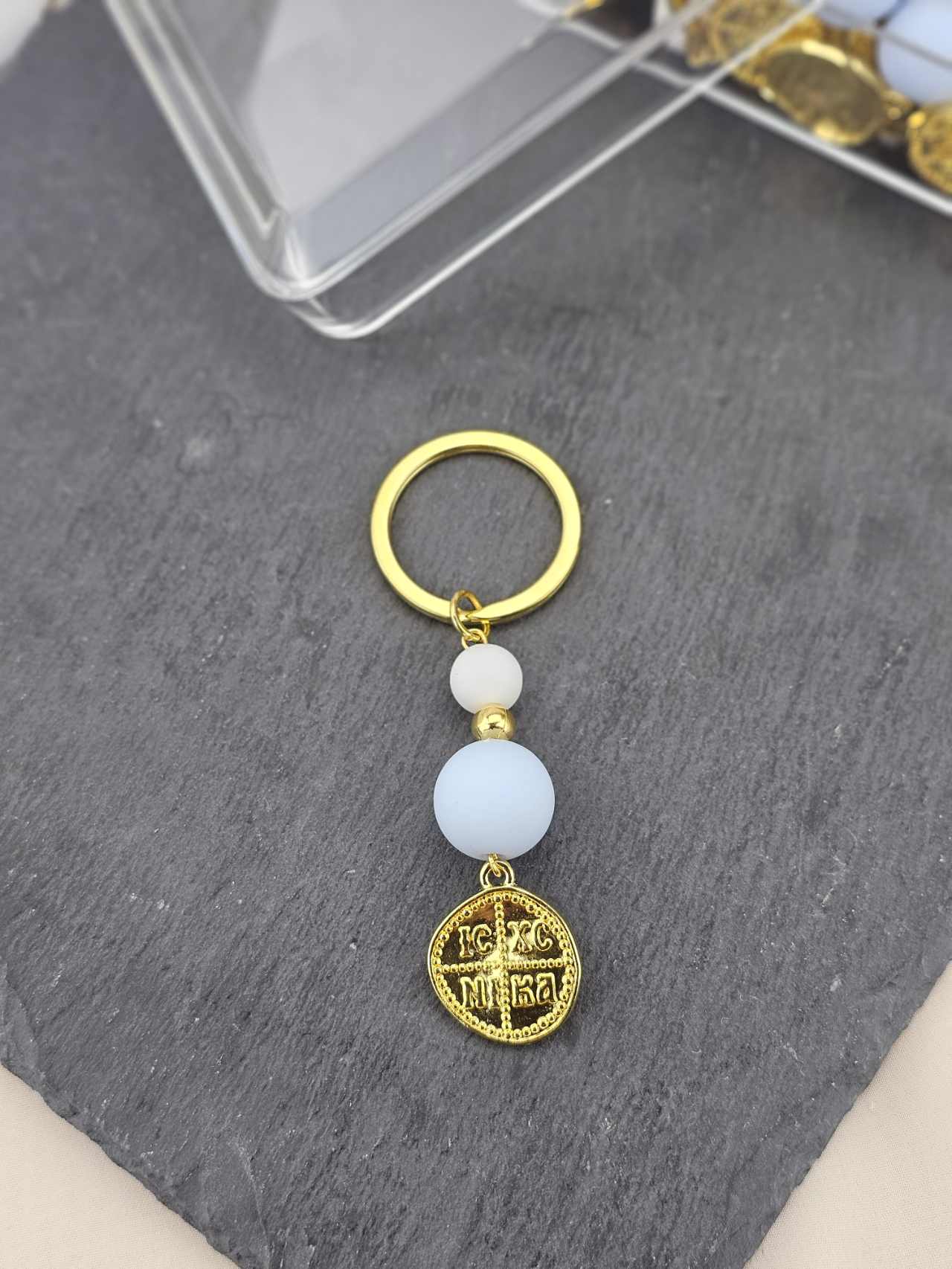 Χειροποίητο μαρτυρικό βάπτισης μπρελόκ με χάντρες και επίχρυσο Κωνσταντινάτο.Η συσκευασία περιλαμβάνει 50 τεμάχια και το κουτί μαρτυρικών.