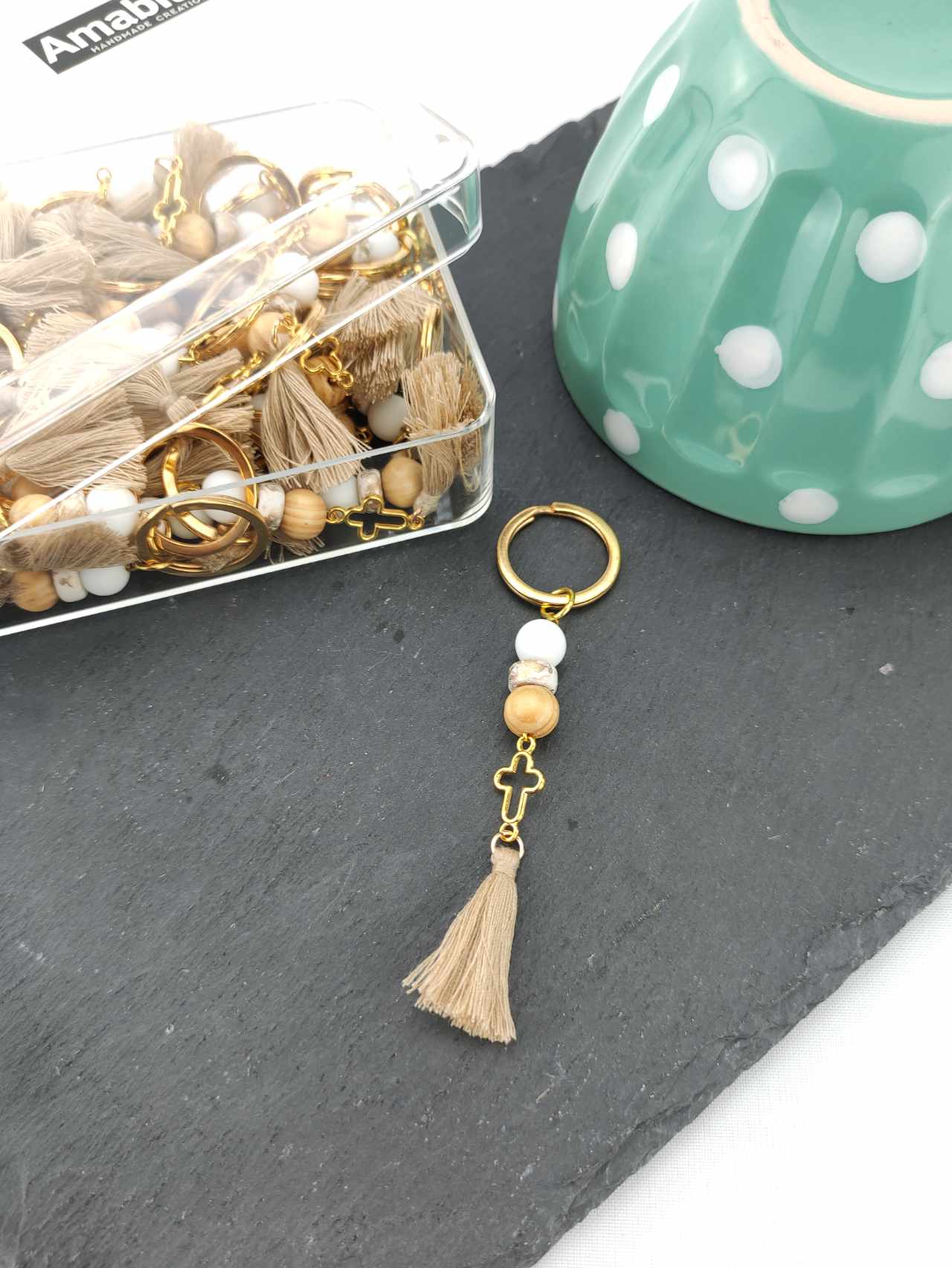 Χειροποίητο μαρτυρικό μπρελόκ με ακρυλικές και ξύλινες χάντρες,κεραμική ροδέλα , φουντάκι και επίχρυσο σταυρό. Η συσκευασία περιλαμβάνει 50 τεμάχια και το κουτί μαρτυρικών.
