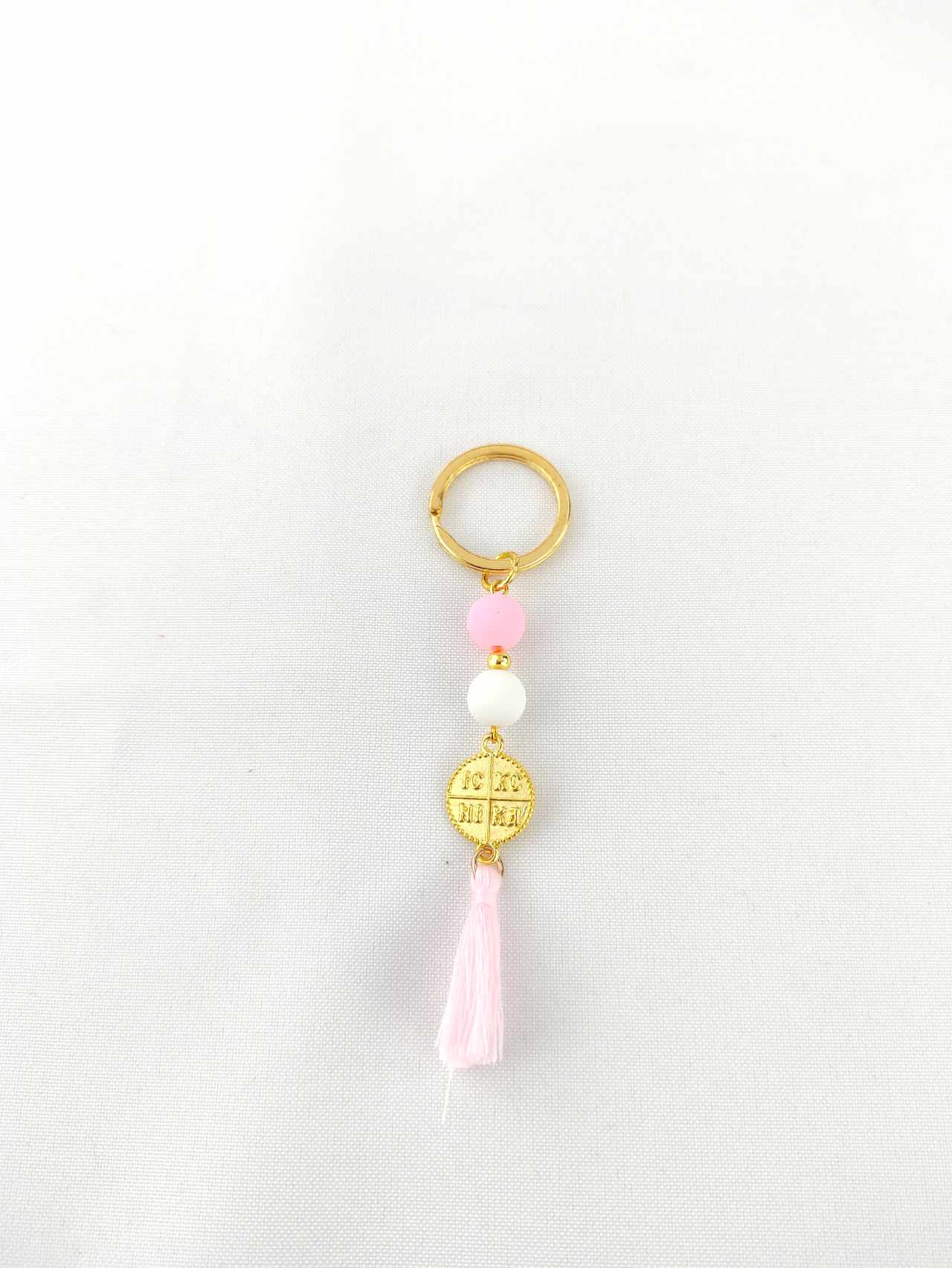 Χειροποίητο μαρτυρικό μπρελόκ με ακρυλικές και ξύλινες χάντρες,κεραμική ροδέλα , φουντάκι και επίχρυσο Κωνσταντινάτο. Η συσκευασία περιλαμβάνει 50 τεμάχια και το κουτί μαρτυρικών.