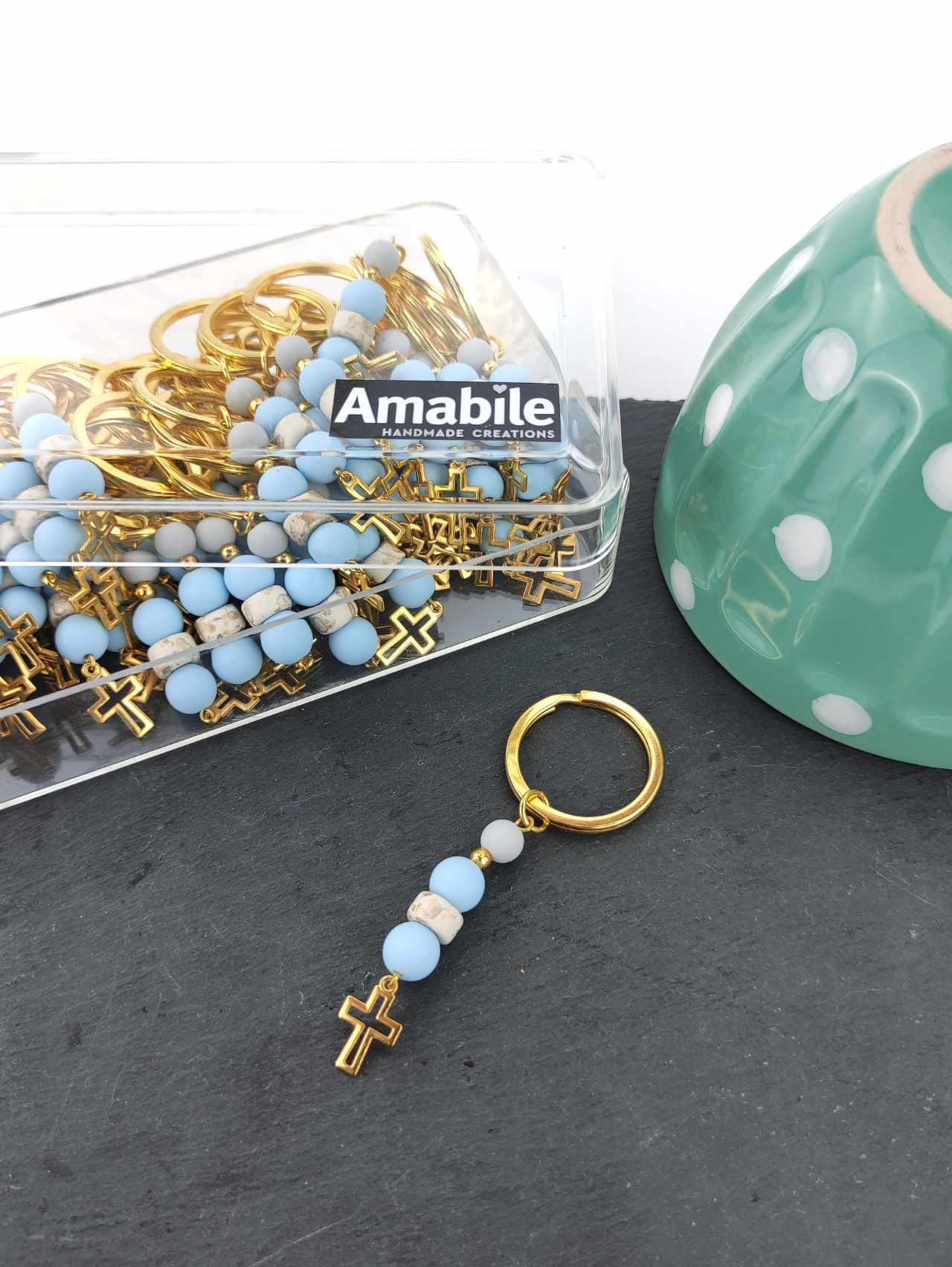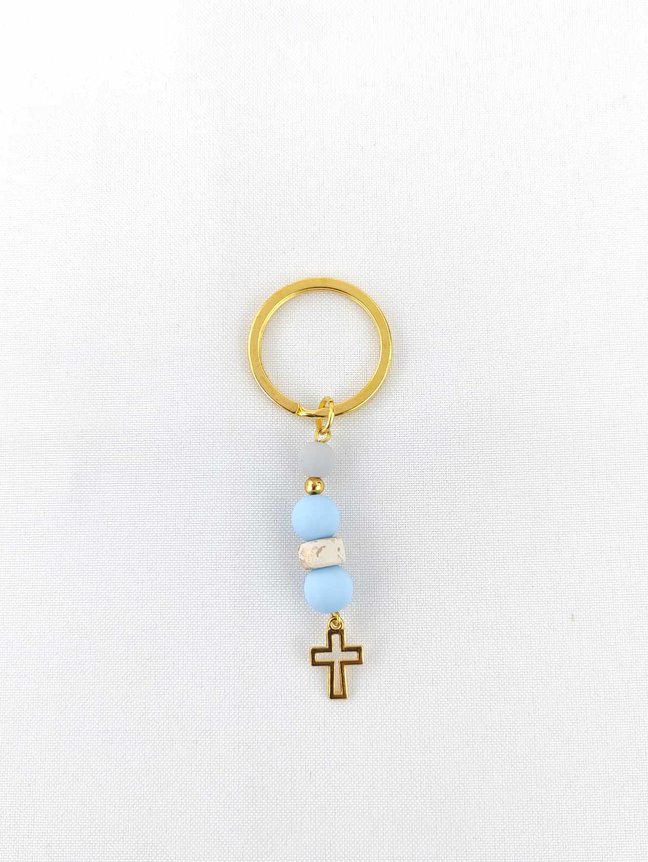 Χειροποίητο μαρτυρικό βάπτισης μπρελόκ με χάντρες και επίχρυσο σταυρό.Η συσκευασία περιλαμβάνει 50 τεμάχια και το κουτί μαρτυρικών.