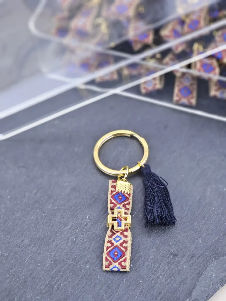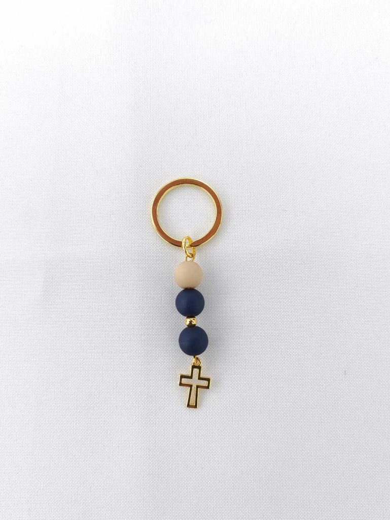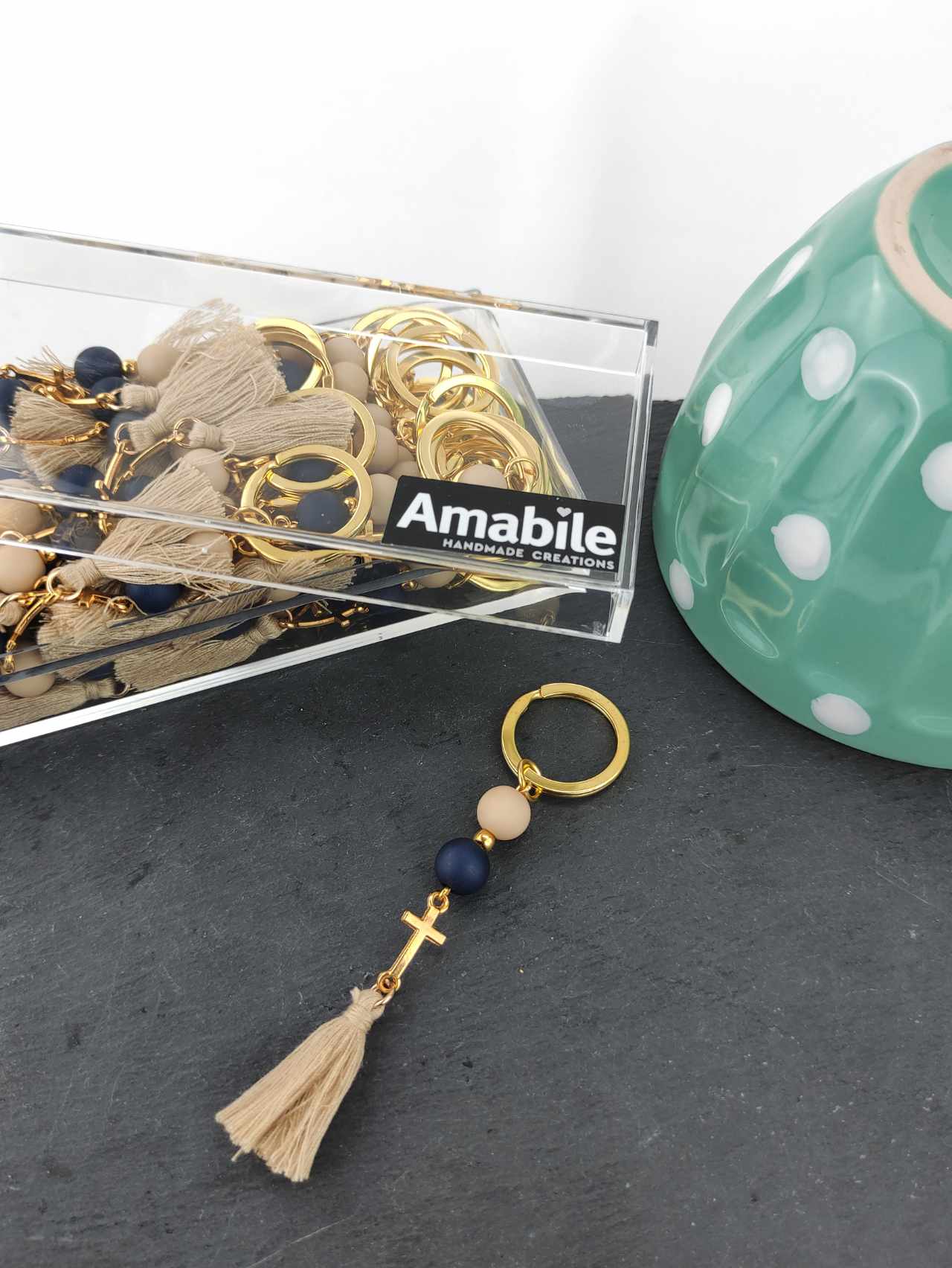 Χειροποίητο μαρτυρικό βάπτισης μπρελόκ με χάντρες, επίχρυσο σταυρό και φούντα.Η συσκευασία περιλαμβάνει 50 τεμάχια και το κουτί μαρτυρικών.