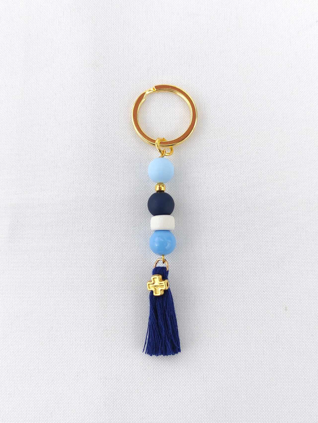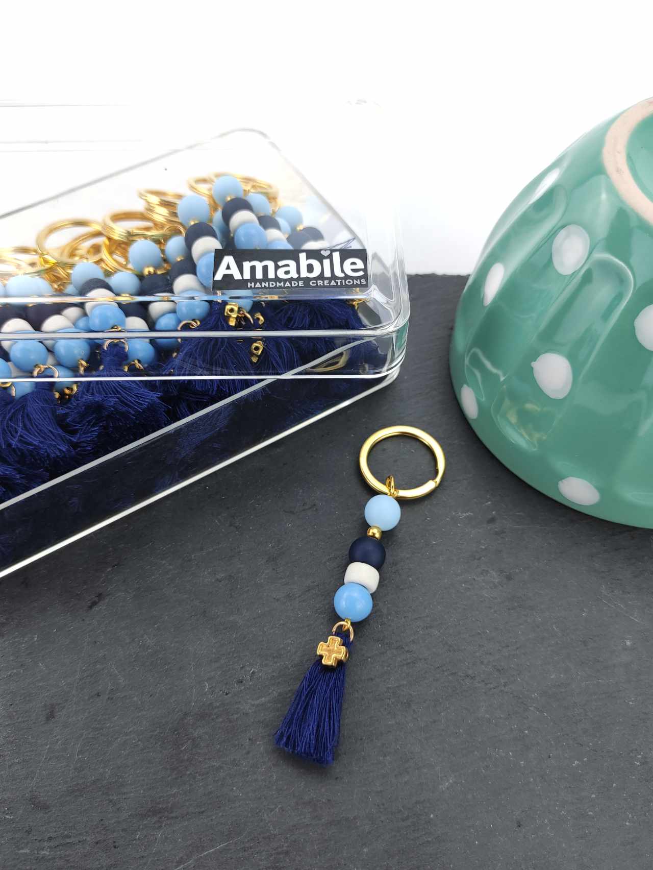 Χειροποίητο μαρτυρικό βάπτισης μπρελόκ με χάντρες, επίχρυσο σταυρό και φούντα.Η συσκευασία περιλαμβάνει 50 τεμάχια και το κουτί μαρτυρικών.