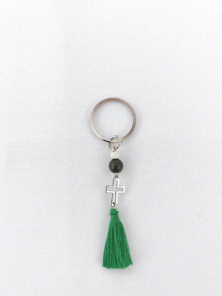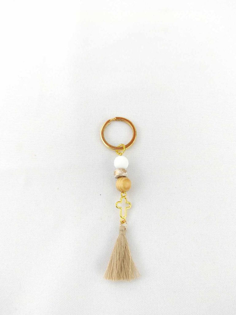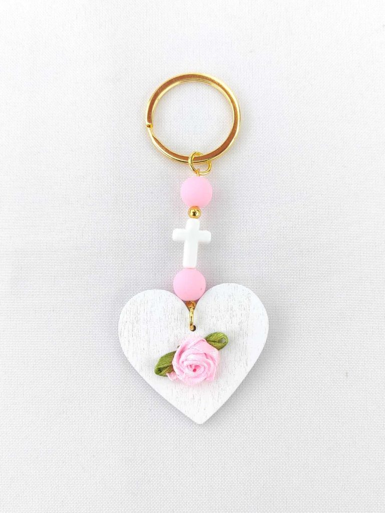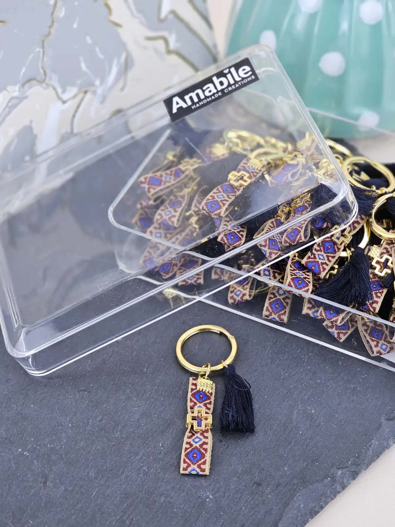 Χειροποίητο μαρτυρικό μπρελόκ με κορδέλα, φουντάκι και επίχρυσο σταυρό. Η συσκευασία περιλαμβάνει 50 τεμάχια και το κουτί μαρτυρικών.